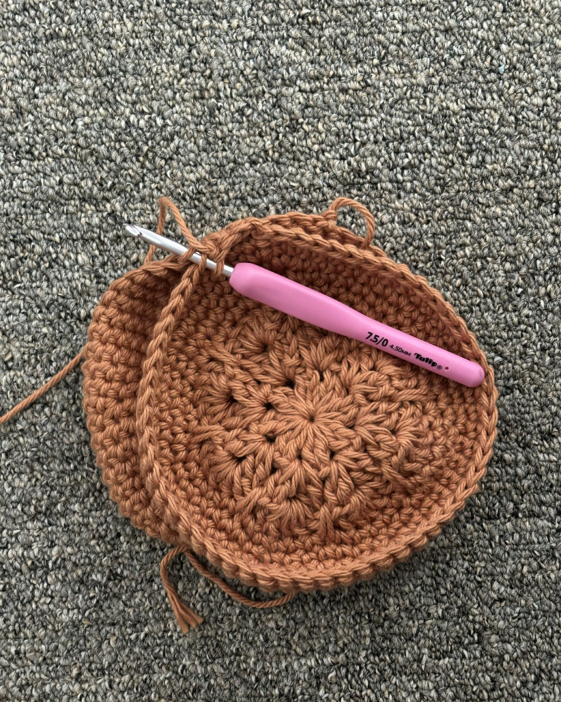Be sure to turn your chicken inside out before beginning the bag! We will be working in the previously unused loops when we were connecting and around the open side piece without the scallops.